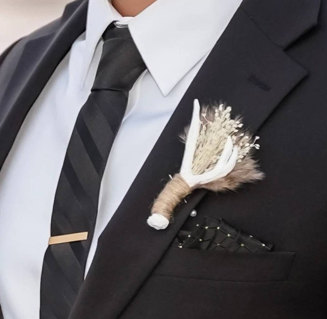 This is a listing for 1 Boutonniere- Featuring a Small, Handmade, Resin, Faux Antler. Decorated with Dried Babysbreath and Pampas Grass. Perfect and crafted for a Country Outdoorsy themed Wedding.