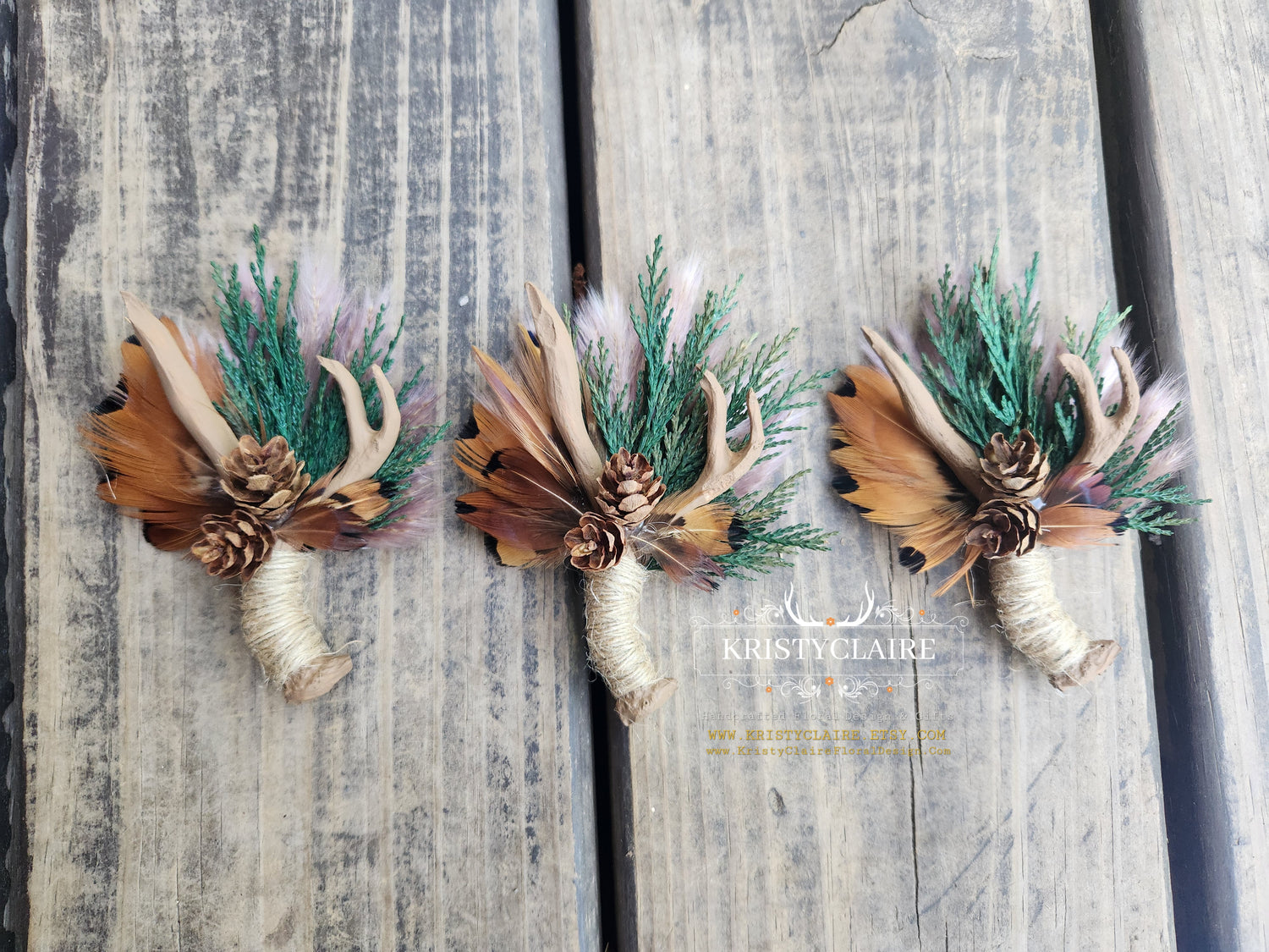 This is a listing for 1 cute Boutonniere that features a small, handmade, resin, Faux Antler. Decorated with Preserved Cedar, Pampas Grass, Pheasant Feathers & Baby Pine Cones.