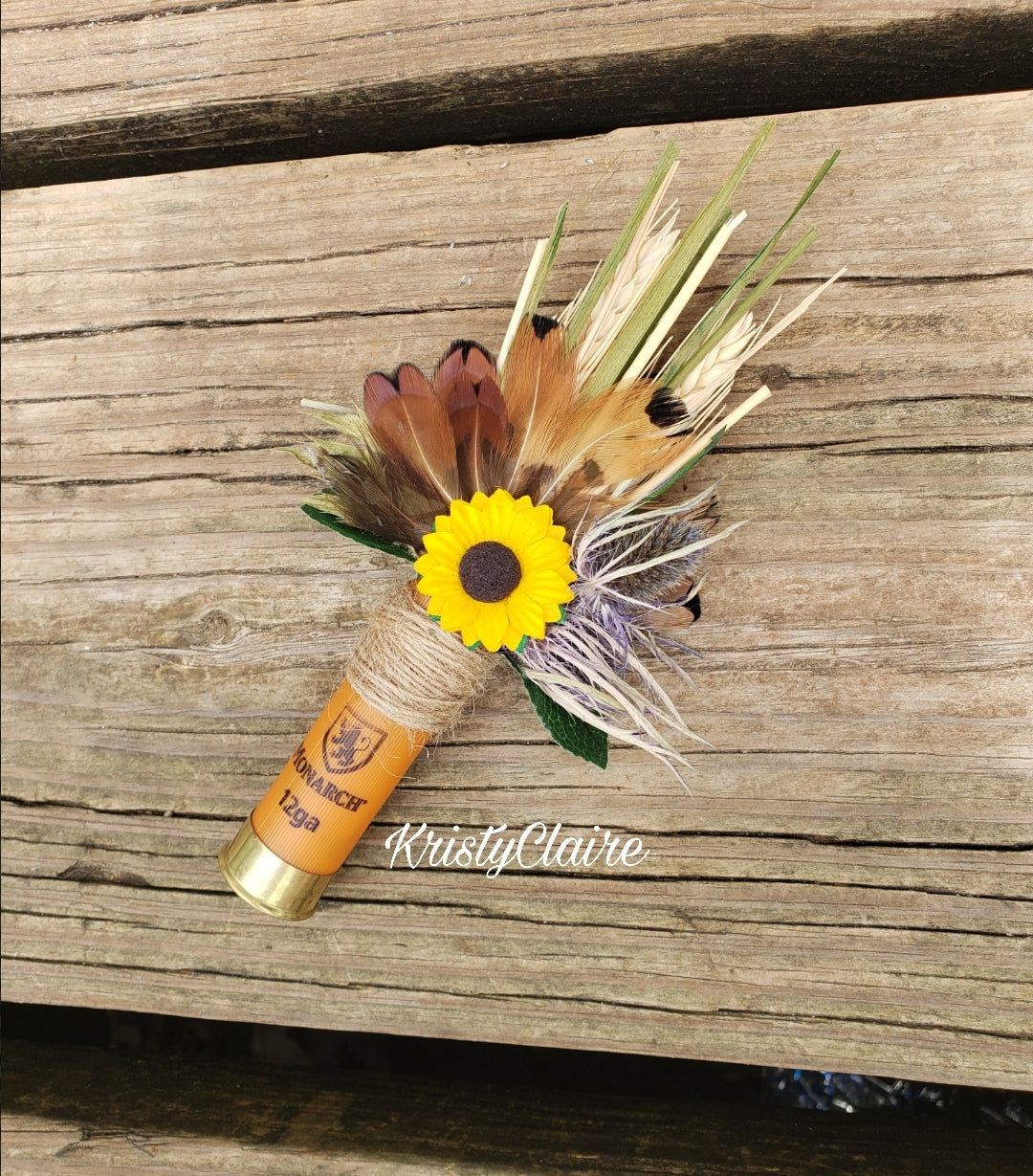 Orange Sunflower Shotgun Shell Boutonniere, lapel, buttonhole, pin-on, corsage, Dried Wheat, Grass, Thistle, Pheasant Feathers